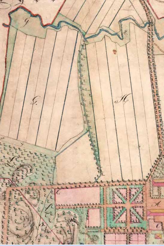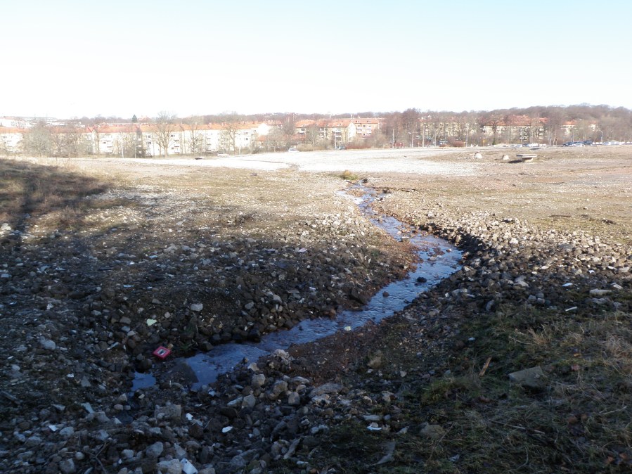Den vänstra av de två små bäckar som syns på kartan ovan är det som nu åter söker sig fram på ytan. Den högra bäckfåran är ännu väl dold under den moderna markytan.