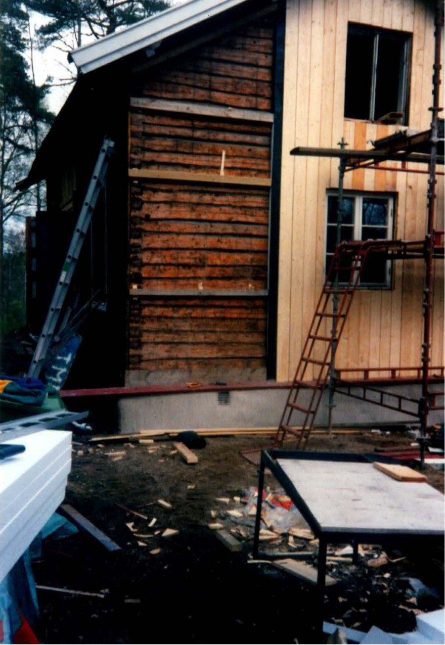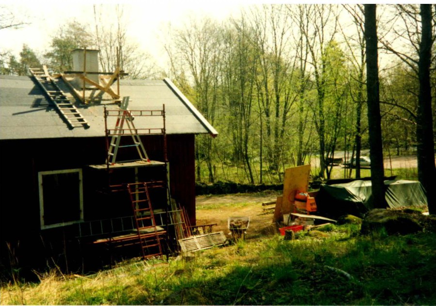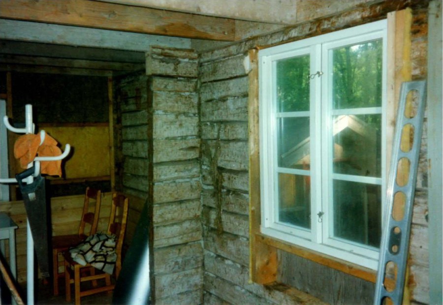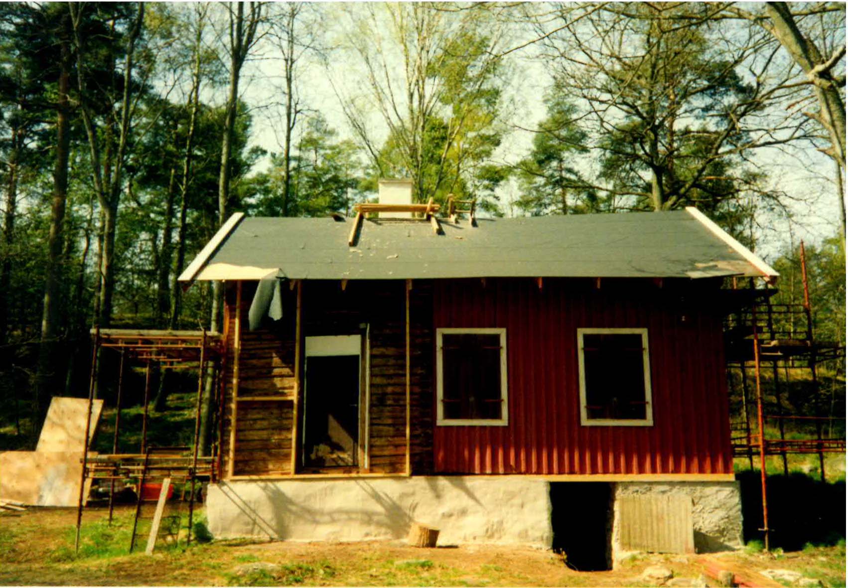 När Mats tog över torpet 1992 var det mycket förfallet. På bilden ovan ser man hur taket nästan rasar in över stugan. Det gamla tegeltaket har tagits bort och taket skall genomgå en grundlig renovering. Även invändigt var det riktigt illa ställt med både golv och väggar.