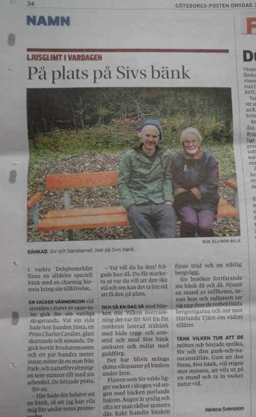 Ganska ofta tar jag en motionsvandring kring Brudaremossen, då passerar jag ibland en bänk som utmärker sig jämfört med de många andra bänkarna i Delsjöområdet, den har ett namn inristat i ryggstödet – Sivs bänk. Jag har inte haft någon kännedom om bakgrunden, men i dagens Göteborgs-Posten kom svaret!