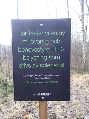 Den som passerar på den lilla gång- cykelvägen nära Svarttjärn har den senaste tiden kunnat se några märkliga belysningsstolpar, alla hämtar sin kraft från solen. Det är ett test av olika tekniker för att se om det går att lysa upp park- och skogsområden utan att behöva dra dyrbara kablar. Belysningen har dessutom censorer som gör att den tänds när någon är i närheten. Det är Leading Lights AB från Göteborg som ligger bakom försöket.