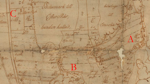 På den moderna satellitbilden nedan finns Östergårdens läge utsatt.