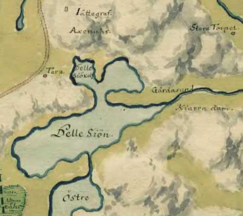 Det är faktiskt ganska lätt att orientera sig på kartan från 1725. Kartan är inte orienterad med norr uppåt som vi är vana vid, istället är väster uppåt på kartan. Därmed kommer Stora Delsjön (Delesjiön) överst och Lilla Delsjön (Östra Dele Siön) längst ned. Biörketjärn finns också utsatt. I Delsjön finns även Delesiö Kalf utsatt, det är samma område som ibland kallades Lilletjärn, i det närmaste en egen liten sjö.
