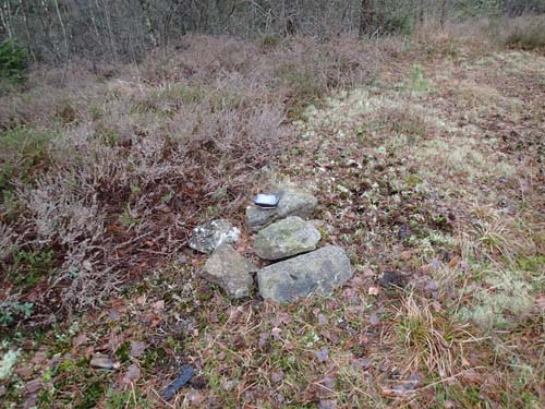 ”Stensättningsliknande lämning, 2 m diam och 0,2 m h. av 0,2-0,3 m st stenar. Utrasad. Övertorvad och bevuxen med gräs. På hällkrönet omedelbart ö härom är en järndubb (fix?) och flygfotomarkering. Möjligen sentida, men bra läge.”