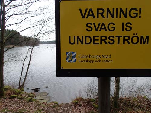 Ny info-tavla nära Delsjökärr. Foto: Per Hallén 2014Nog är det svag is! Foto: Per Hallén 2014Kolerakyrkogården och hällkistan. Foto: Per Hallén 2014Skolan och vattenreservoaren i Kallebäck. Foto: Per Hallén 2014