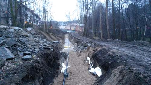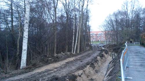 Den 11:e oktober berättade jag om att arbetet med att gräva ned kraftledningen genom Björkekärr hade inletts. Då pågick arbeten nära torpet Korpås tomt och bort mot Studiegången, förbi torpet Rosendal och Gömmet vidare ned utmed Lindhultsgatan. Stora delar av den sträckan är nu klar och det stora diket har fyllts igen. Istället pågår arbeten förbi Vidkärrs kvarndamm och vidare upp i området nära torpet Dala i riktning mot Östra Sjukhuset.