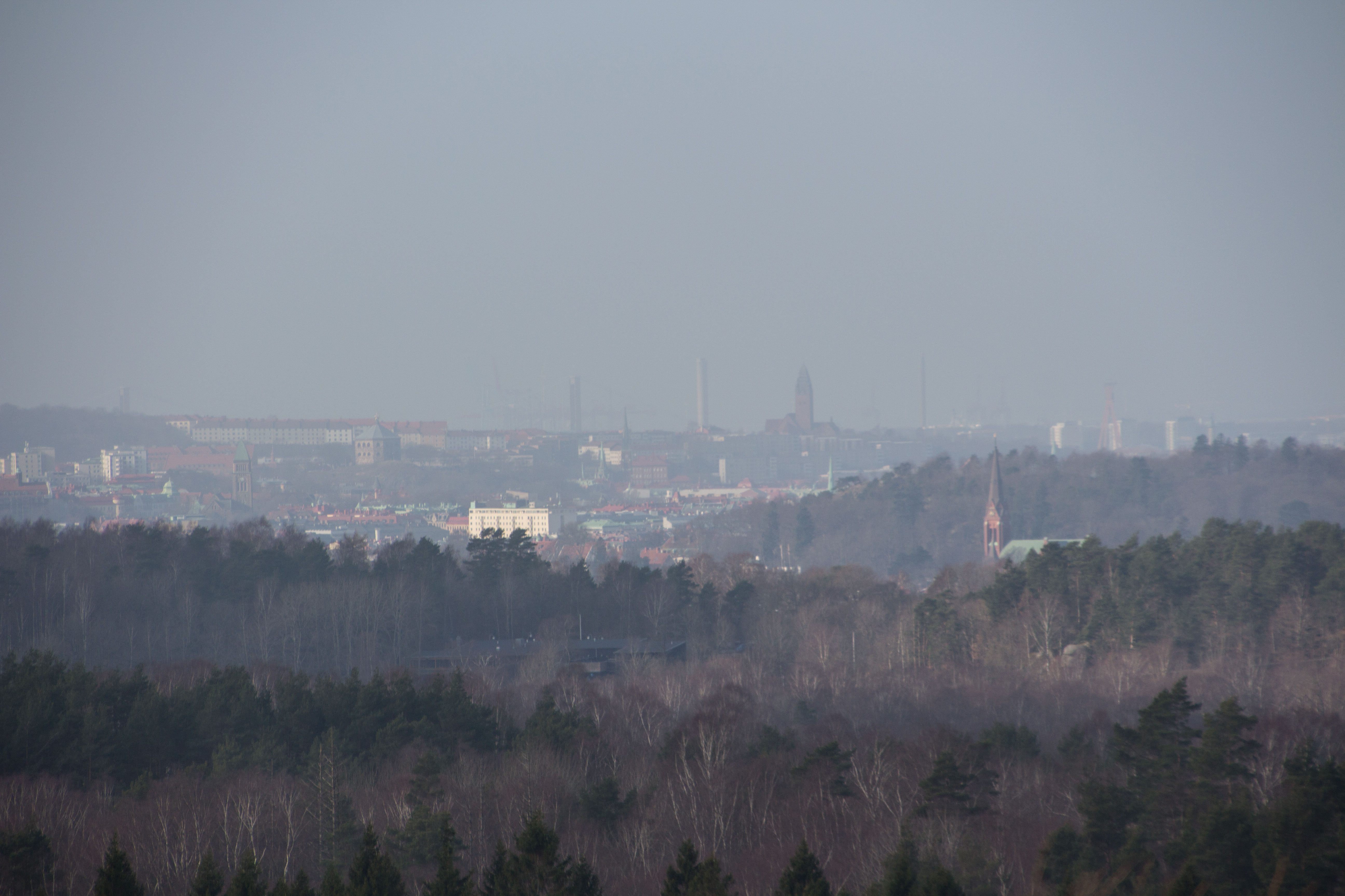 Bilden ovan är från Getryggen, inte långt från gränsen till Partille. Mitt i bilden kan du se en mörk byggnad mellan träden, det är Skatås motionscentral. Bortanför, i diset, framträder Örgryte nya kyrka, Skansen Kronan och Masthuggskyrkan. Delsjöområdet ligger mycket centralt!