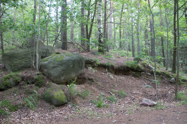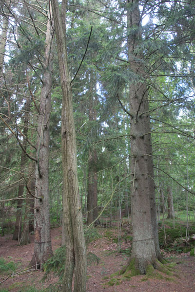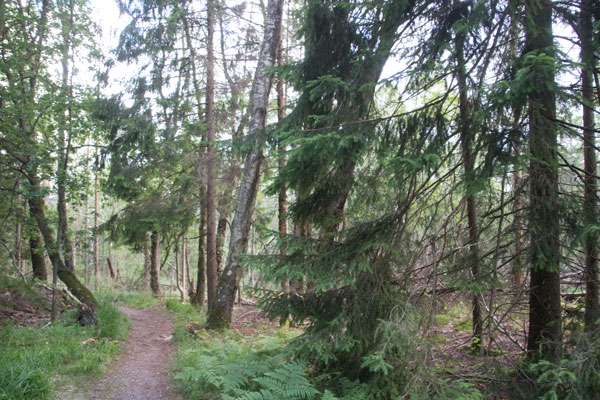 ”Till station 14. C:a 300 m. Följ stigen. Efter ungefär 100 m går den ner mycket brant. Nedanför branten delar sig stigen – gå till vänster. Det blir nu mer eller mindre plant. Efter något hundratal meter kommer Du till den lilla grandungen där Du stannar. Dungen ligger i en vänsterkurva på höger sidan av vägen. På vägens vänstra sidan reser sig en bergknalle.” Idag är det mesta av granskogen borta, offer för stormar och även här granmördarens härjningar.