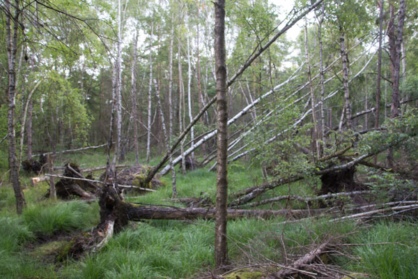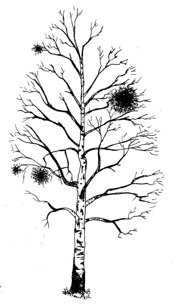 ”Speciellt vintertid syns häxkvastarna tydligt. De ser ut som små skatboliknande tofsar där de sitter och Du hittar dem framförallt på grenar hos glasbjörk. Inne i grenen sitter en svamp som kraftigt stör den naturliga skottbildningen och runt det svampinfekterade stället växer en massa kvistar ut. En s k häxkvast har bildats. Konstigt nog är det ofta bara ett eller några få träd som blir angripna och runtomkring kan de stå en hel skog av friska träd.” Vid mitt besök i juli månad syntes inte några häxkvastar, men det är möjligt att de fanns där, dolda i grönskan.