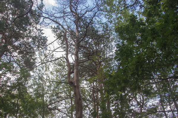 ”Kom närmare och studera mönstret i de döda tallarnas ved. Konstnärerna bakom den sirliga utmejslingen är olika barkborrar – små skalbaggar som ibland kan göra stora skador på skog. Hanen och honan borrar sig in under barken, på försvagade träd eller obarkat timmer, och parar sig där. Honan gnager sedan en kraftig modergång och med jämna mellanrum görs små fickor där äggen läggs. När de kläcks äter sig larverna genom barken bort från modergången.