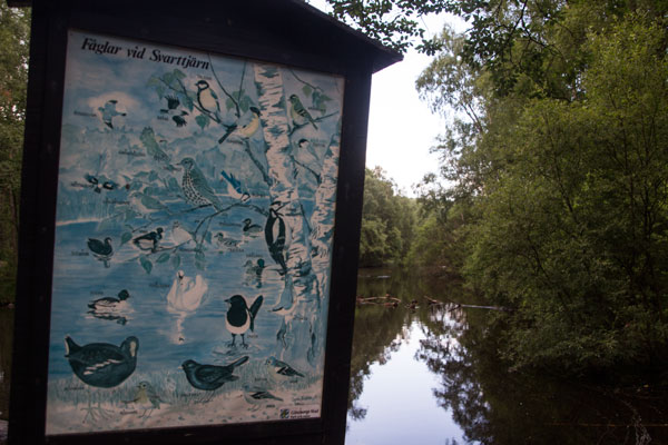 ”Till station 10. C:a 500 m. När stigen delar sig nedanför branten tar Du den högra stigen ner mot sumpområdet. Stigen följer ännu en brant på den västra sidan. En stor sten på vägens högra sida passeras. När stigen når vägen tar Du till höger och vandrar ner mot Svarttjärns södra udde. Studera den uppsatta fågelplanschen om Du är osäker på vilka fåglar Du ser.”
