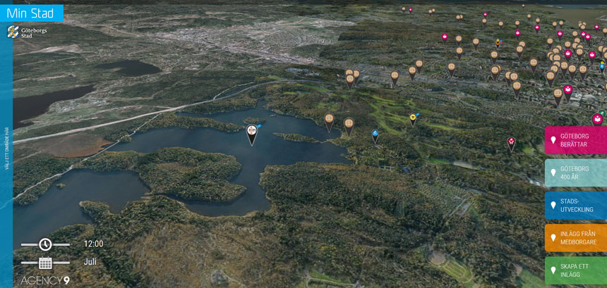 I sidhuvudet ser du hur kartbilden ser ut och klickar man på exempelvis kamerasymbolen vid Delsjöbadet så kommer en bild från Göteborgs stadsmuseum fram. Plocka fram dina bilder och minnen från Delsjöområdet och visa upp dom på ”Min Stad”.