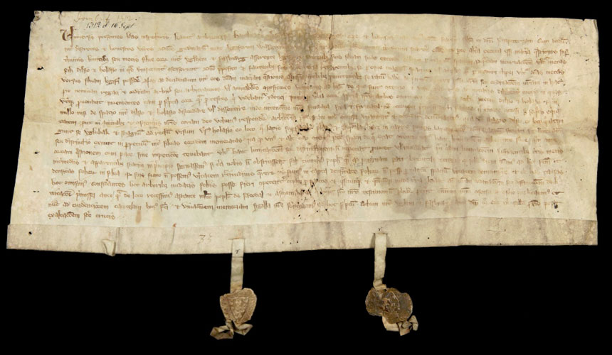Detta vårt förordnande eller denna vår bestämning av omnämnda gräns hava vi med allas vårt samtycke och råd kungjort innan vi avlägsnade oss från platsen. Då var mycket folk från Sävedalen och Askims härad närvarande, och de kunna avgiva vittnesbörd angående denna vår åtgärd. Och nu hänga vi såsom en tydligare försiktighetsåtgärd våra sigill under denna skrivelse, för att denna åtgärd må bevaras i livligare minne. Givet mellan Ugglum och Fässberg i Herrens år 1312 på lördagen närmast efter det heliga korsets upphöjelse.” (Mölndal: lantbruks- och trädgårdsstad s. 33)