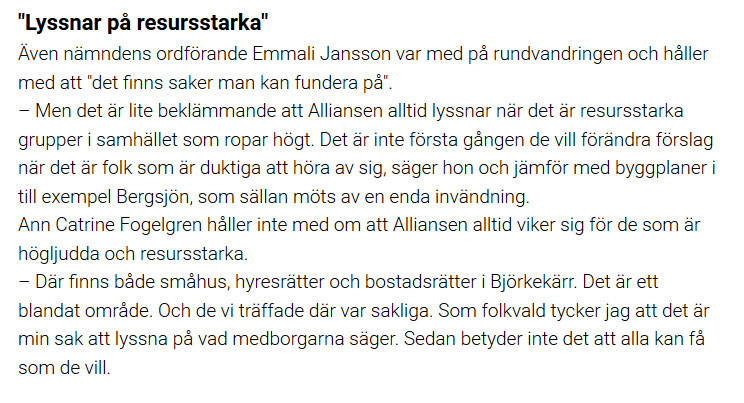 Är det ett demokratiskt problem att människor i en stadsdel yttrar sig i en fråga på grund av att det är tyst i en annan stadsdel? Det är väl tystnad som är ett demokratiskt problem, inte när människor är delaktiga i samhällsdebatten. En politiker borde inte ställa sig negativ och avvisande till ett folkligt engagemang, det bör väl ändå uppmuntras i alla stadsdelar. Givetvis kan det ”ställa till det” för den som planerar att bygga, det kan ta längre tid, det kan bli ändringar, men så är det i en demokrati.
