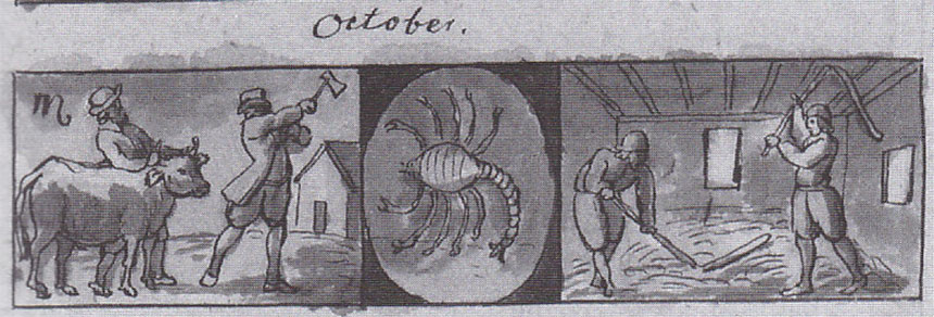 Under oktober månad var det lämpligt att gräva upp stenar som låg i vägen för jordbruket, bryta upp rötter som kunde användas till läkedom, speciellt Alands-roten angelica och baldrians-roten och insamling av ollon. Jakt på hare kunde också vara lämpligt under oktober. Broocman kom dessutom med avslöjandet att ryktet om att både hanen och honan födde ungar är oriktigt! Det är helt enkelt så att ”Harar äro ganska fruckt- och afwelsamma djur” slår han fast.