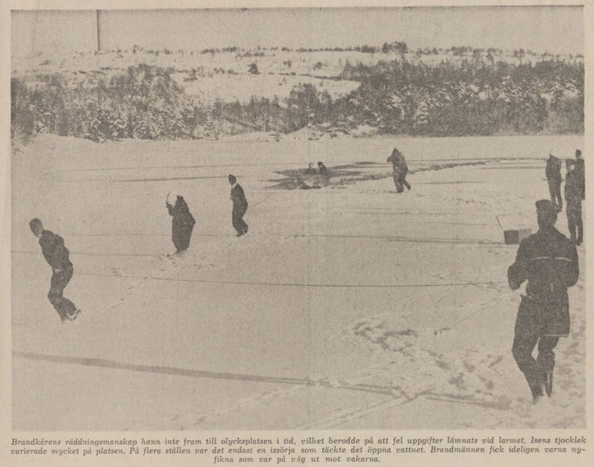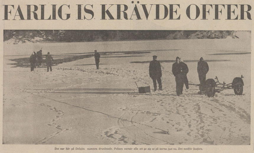 ”100-tals människor svävade i livsfara på Delsjöns is under nyårsaftonen. Nedanför den stora skidbacken var isen på vissa håll bara ett par centimeter tjock. Inte förrän drunkningsolyckan inträffade på middagen ordnades bevakning och varningsskyltar. På många håll täckte bara ett tunt lager issörja det öppna vattnet. Och många hundra skidåkare korsade sjön. – Det är underligt att inte fler olyckor inträffad, sade brandingenjör Birger Lennmalm.