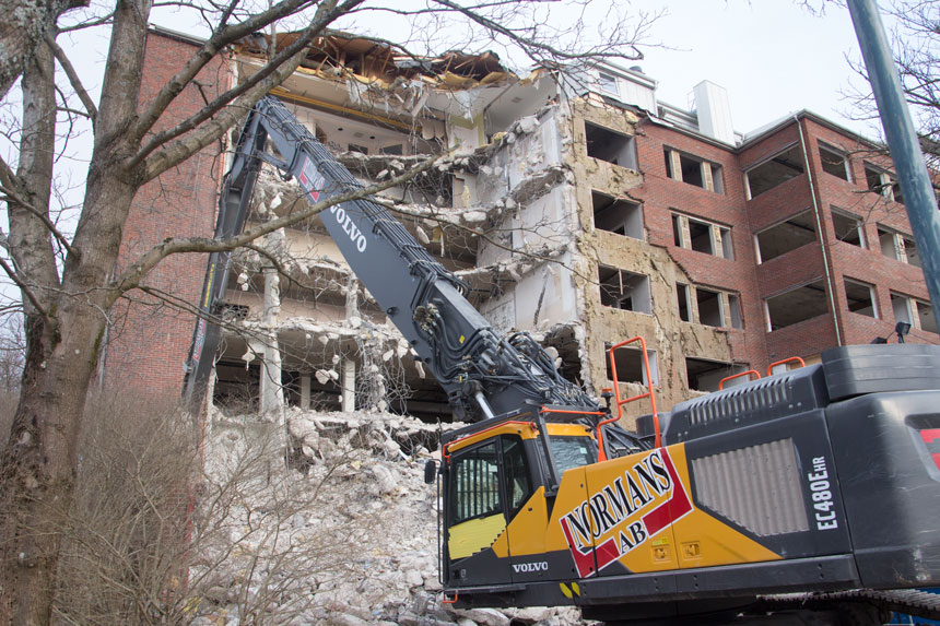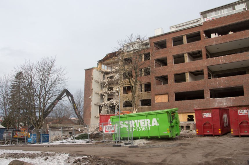 Kålltorps sjukhem byggdes 1966-69, vilket inte är någon hög ålder för ett hus. Ändå har stadens styrande beslutat att riva byggnaden och ersätta den med en ny skola och bostäder. Rivningen har pågått invändigt under hösten, nu har rivningen av själva byggnaden inletts.