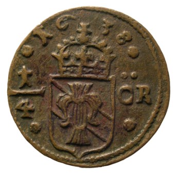 Myntet är ett 1/4 öre kopparmynt från 1636, präglat vid de statliga myntverken i Nyköping och Säter.