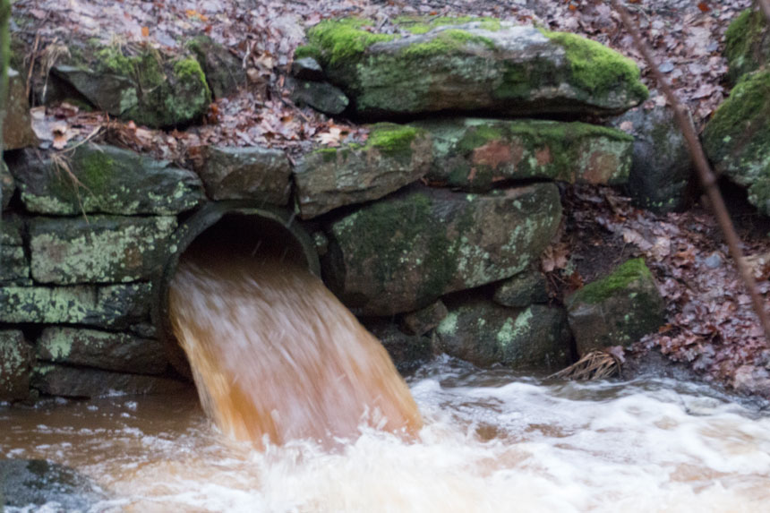 Hej. Jag har sett de höga flödena och översvämningen idag. Orsaken till översvämningen är att det nedre röret, alltså under det på bilden, är helt igensatt. Även det övre var delvis igensatt av löv men jag rensade det för ett par veckor sedan, annars hade översvämningen senaste regnen gått över vägen. Uppenbarligen finns det ingen som har ansvar för den skötsel som trots allt behövs i området.