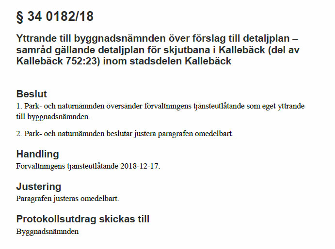 Tjänstemannaförslaget till nämnden när det gäller skjutbanorna var formulerat enligt följande: ”Park- och naturförvaltningens huvudsakliga synpunkt är att alla de utpekade skjutbanorna ska flyttas, till den nya banan eller till annan plats i Göteborg, för att få en bättre ljudmiljö i Delsjöområdet. Förvaltningen anser att detaljplanen bör genomföras endast om alla de utpekade skjutbanorna flyttas.” Vid mötet den 4 februari beslutade enligt vad tjänstemännen föreslagit, alltså att samla all verksamhet till en modern anläggning alternativt flytta verksamheten från området.