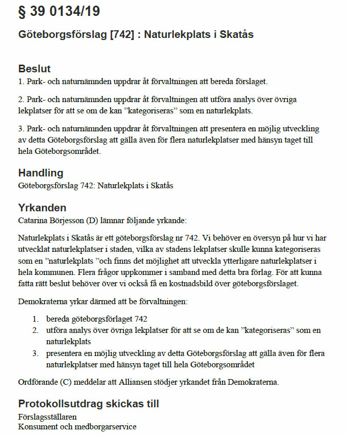 Det andra beslutet i nämnden rörde Göteborgsförslag 742 om en naturlekplats i Skatås. Beslutet blev att Park- och naturförvaltningen får i uppdrag att bereda förslaget samt att se över frågan om några lekplatser som finns i dag kan ”kategoriseras” som naturlekplats. Dessutom skall Park- och naturförvaltningen undersöka om naturlekplatser kan anläggas även i andra delar av Göteborg. Beslutet byggde på ett yrkande av Demokraternas Catarina Börjesson som fick stöd av Alliansen.