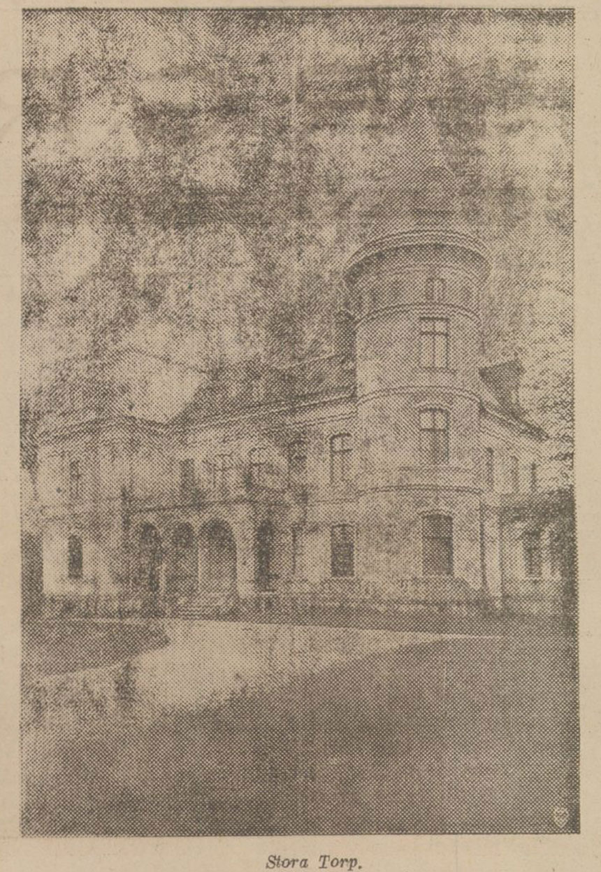 Vandraren kan icke undgå att imponeras af Stora Torps ståtliga utseende. De många, som taga sin söndagspromenad till Delsjön, brukar gärna passera förbi den vackra byggnaden, där den ligger på en höjd, med en dominerande utsikt öfver hela dalen. Förr i världen hette egendomen helt enkelt Torpet och ägdes af fältmarskalken Gutaf Wrangel, som lämnade den i arf till sina söner, Johan Mauritz och Gustaf Herman. Någon gång i midten på 1700-talet kom den i händerna på stadskassören Kollinius i Göteborg , som innehade den till år 1770. Collinius var en mycket orginell herre och utmärkte sig särskildt genom det lysande sätt, hvarmed han firade Gustaf II:s statshvälfning af år 1772. Det skedde genom gudstjänst, kanonsalut och stora kalas. Senare ägdes Stora Torp af grosshandlanden David Carnegie och konsul Oskar Ekman. Sedan 1907 innehafves det af den sistnämndes arfvingar, som brukar tillbringa en del af försommaren på den vackra egendomen.