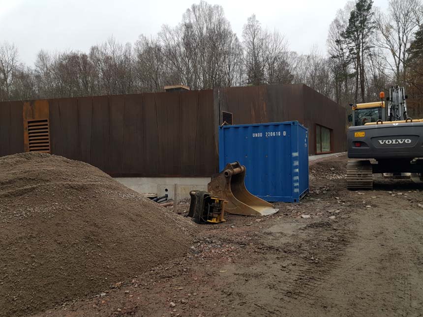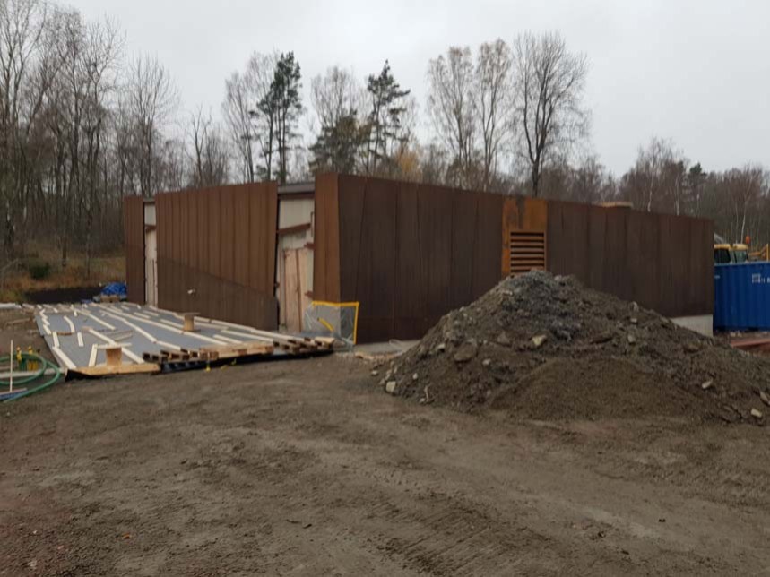 Det nya reningsverket nära Brudaremossen har nu till stor del fått sin fasad. Det verkar som om man redan från start har lyckats sätta upp rostig plåt på väggarna. Tanken är väl att det skall ”smälta in” bättre. Då byggnaden står vid en gammal soptipp förefaller rostig plåt som ganska lämpligt, ser ut som om den återvunnits ur tippen.