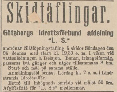 Den 23 februari berättade Göteborgs-Posten: ”Skidtäflingar. Som annons i dagens tidning synes, anordnar ”L.S.” skidlöpning å skidor i morgon kl. 12.30 e.m. å Delsjön med start å viken vid vattenledningen. Start och mål äro på samma ställe, och blir täflingen så mycket intressantare som de täflande skola två gånger passera den triangelformiga banan och således nästan hela tiden äro under åskådarnes ögon. Skidföret å sjön är utmärkt. Priserna äro ”L. S:s” och ”Nordens” medaljer” (Ur: Göteborgs-Posten 23 februari 1901)
