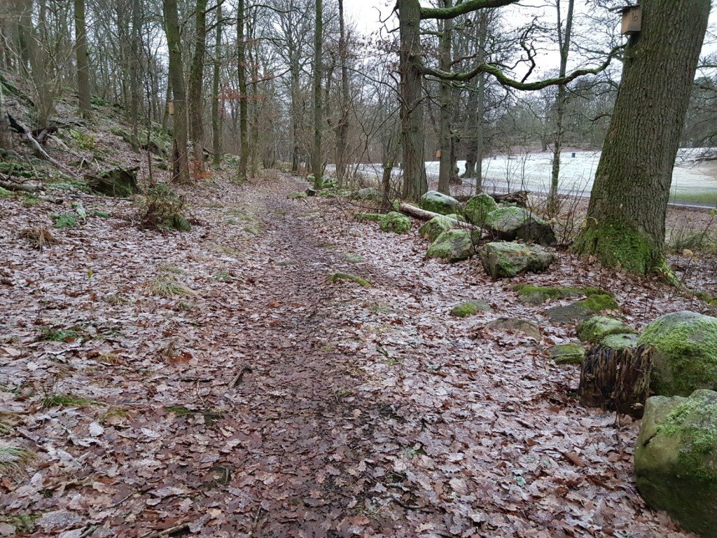 Jämför bilden med kartan och du ser tydligt ännu fägatans sträckning med stenmuren till höger i bild och på kartan och till vänster sluttningen av Kålltorpsåsen. 1700-tals kartans är alltså användbar även 2020.