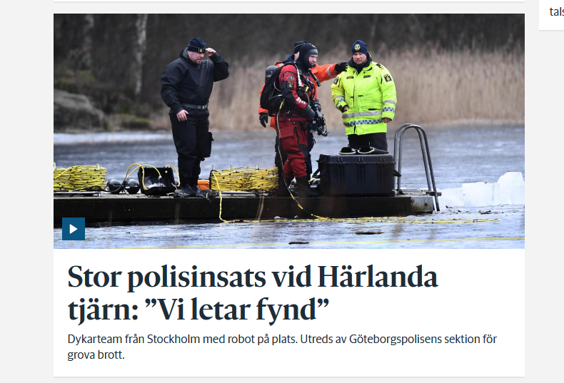 Vid nio-tiden på onsdagsförmiddagen spärrade polisen av ett området vid Härlanda tjärn, berättar Göteborgs-Posten, insatsen och avspärrningarna skall ha varit kvar ännu vid 16-tiden. Vid tjärnen arbetar ett dykarteam från sjöpolisen i Stockholm med både dykare och en undervattensrobot. Polisens sektion för grova brott leder utredningen men exakt vad det är man letar efter uttalar man sig inte om, inte heller om något hittats.