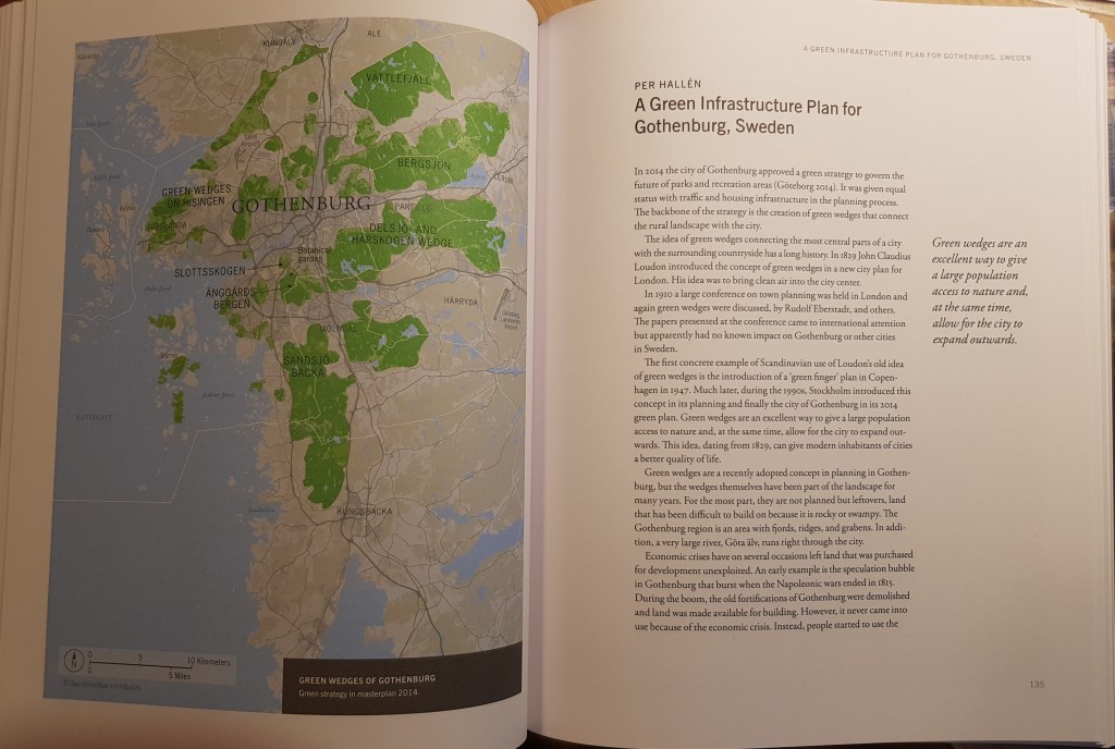 Allt sedan konferensen ”Large Parks in Large Cities” hölls i Stockholm 2015 har arbetet med en bok med ett globalt perspektiv på parker och grönområden i städer pågått. Som alltid vid internationella projekt som detta tar det tid att få allt klart. I dag höll jag boken för första gången i min hand, det är en ”tegelsten” på 586 sidor där områden över hela världen presenteras ur olika perspektiv. Läsaren får bekanta sig med Central Park i New York, Pavlovsky Park i St Petersburg, Tijuca National Park vid Rio de Janeiro, Sanjay Gandhi National Park vid Mumbai – totalt 37 olika parker och teman. Ett av dessa går under rubriken ”A Green Infrastructure Plan for Gothenburg”, av Per Hallén. Där presenteras de gröna kilarna i Göteborgsområdet och däribland Delsjöområdet. I kapitlet presenteras även Göteborgs stads grönstrategi som var avsedd att placera grönområden på samma nivå inom planeringen som t.ex. infrastruktur, detta prövas sedan mot verkliga förhållanden och vad som hände i samband med planarbetet vid Härlanda tjärn. Där visade det sig tydligt att grönområden inte har annat värde än som markreserv. I samband med möten med politiker 2018 lovade jag att processen skulle uppmärksammas även internationellt, det har nu skett.