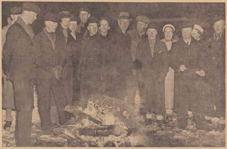 ”Göteborgs-Tidningens och fru Ramkvist-Toreskogs uppvisning på Delsjökärr i går kväll blev synnerligen lyckad. Vädret var det bästa tänkbara och isen hade man heller ingen anledning att klaga på. Den, som inte hade tillfälle se konståkerskan i går, har en chans på söndag middag, då fru Ramkvist-Toreskog tillsammans med några stockholmare har uppvisning på Kvarnbyvallen. På bilden här ovan stå intresserade åskådare kring en stockvedsbrasa på Delsjökärr.” (Ur: GHT 22 januari 1937)