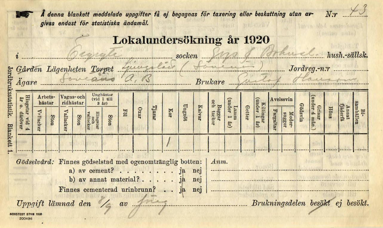 År 1920, alltså nio år efter bouppteckningen, pågick en lokalundersökning av jordbruken i Sverige. Undersökningen gav upplysning om odlingsareal, hur många och vilka husdjur som fanns samt hur stor skörd som producerades på gården. Den praktiska undersökningen genomfördes av Hushållningssällskapet på uppdrag av Statistiska Centralbyrån. På registerkortet för Lungslätt finns brukaren Gustaf Hansson noterad, alltså en av sönerna till Johan August. Enligt uppgifterna i undersökningen hade Ljungslätt fortfarande en ko 1920 men någon häst eller några grisar rapporteras inte. Arealen uppgavs vara en hektar och den användes till odling av potatis och hö. Utsädet uppgavs vara 150 kilo potatis på 0,10 hektar av arealen och det hade under 1919 gett en skörd av 730 kilo potatis. Resterande areal användes för produktionen av hö. Det pågick alltså fortfarande jordbruk vid Ljungslätt ett drygt decennium senare om än att det tycks ha minskat något i omfattning. Det kan också vara så att lokalundersökningen inte fått med all information kring Ljungslätt då platsen inte besökts utan informationen byggde på andrahandsuppgifter.