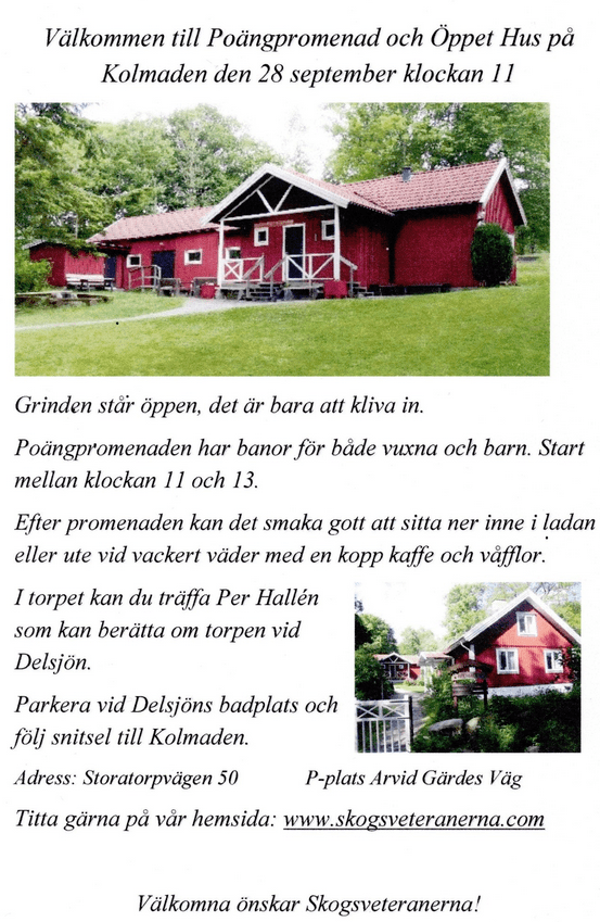 På lördag, 28 september, är det öppet hus på torpet Kolmaden där Skogsveteranerna har sin bas. Jag (Per Hallén) kommer att finnas på plats i stugan och träffa besökare och berätta om Kolmaden och områdets historia. Det finns även möjlighet att köpa böckerna ”Upptäck Skatås” och ”Delsjöskogen”.