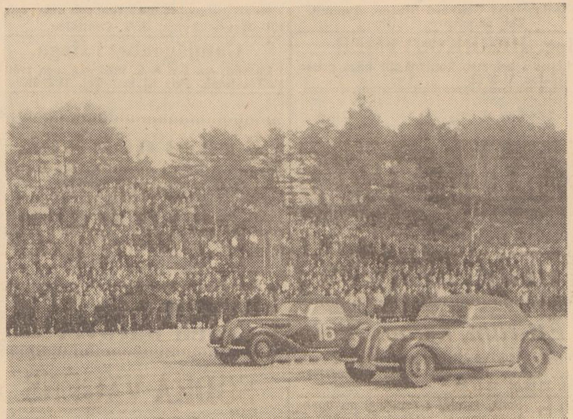 Bilden i sidhuvudet visar starten för två tävlingsvagnar. I bakgrunden syns den stora mängden åskådare. Hämtad ur Göteborgs Handels- och Sjöfartstidning 11 mars 1940.