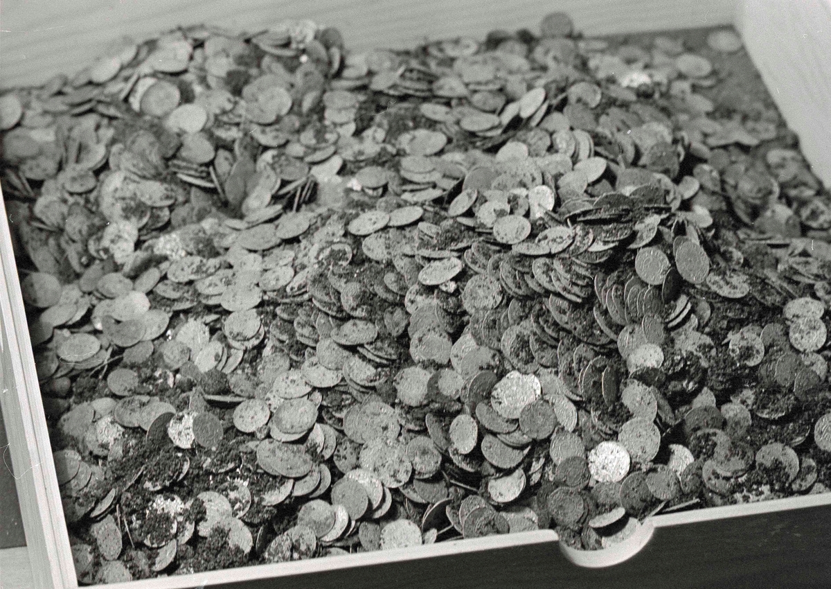 I sidhuvudet visas en silverskatt som bestod av 10.000 örtugor/silvermynt från 1300-1400 talet funna på Bondtorget i Västerås. Hämtad från Digitalt museum.