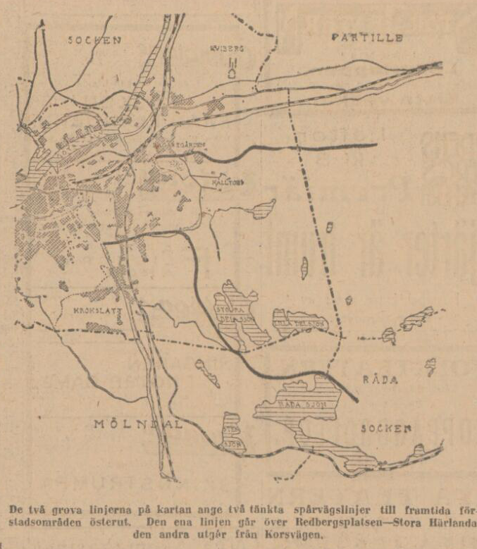”Spårvägsstyrelsen har på sitt program även en annan östlig linje, för vilken Härlandastumpens byggande skulle innebära ett steg framåt – det är linjen Korsvägen–Lilla Torp. Göteborgs införlivande av Örgryte för att vinna utvecklingsmöjligheter mot öster. Delsjöbäckens dalgång är bästa tänkbara plats för en villastad och kommunen har också med blicken öppen härför köpt stora arealer därute, som dock få ligga för fäfot. Sträckan Korsvägen–Lilla Torp skulle göra det möjligt att exploatera dessa områden. Redan nu sträva villorna utåt, men det skulle bli en annan fart om spårvägen gick i teten och det skulle med de intresse för egnahemsbyggande som bostadsnöden framtvingat förmodligen icke dörja länge förrän också denna linje bar sig.