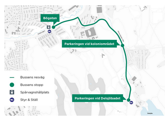 På Göteborgs stads hemsida kan man läsa om den badbuss som skall gå från Bögatan till parkeringen vid Delsjöbadet 16 juni – 10 augusti.