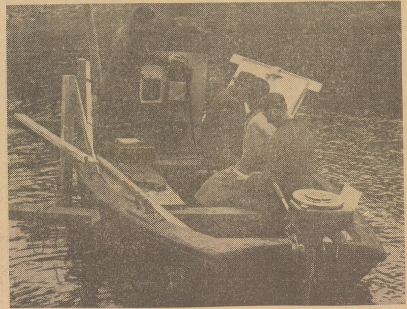 Ekolodsutrustningen har vattenverket fått låna av hamnstyrelsen och en del kompletterande saker har kommit från firma Hammar, som också svarar för den tekniska skötseln. Förutom ingenjör Steen medföljer också en annan export, nämligen Mr. G.H. Stow, och ingenjör Hultman har som medhjälpare från Vattenverket inspektör Stjerneman. Utrustningen har monterats på en kraftig jolle och det hela fungerar perfekt.