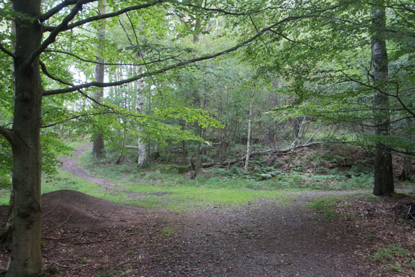 ”Till station 7. C:a 600 m. Vid Kolmaden tar Du avtagsvägen rakt västerut. Gå förbi golfbana 3:s hål, upp över bergsryggen och ner på andra sidan till golfbana 6 utslagsplats. Sväng vänster och följ vägen mellan bergväggen och ”skyddsnätet” runt kröken dyker golfbana 7:s hål upp. Tag här avtagsvägen åt höger (norr). Gå förbi golfbana 8:s utslagsplats. Om ett tag kommer Du fram till en korsning. 20 m ner till höger finns en bänk som lämpar sig utmärkt att läsa sagor på, exempelvis de på punkt 7 i häftet.” Idag stämmer beskrivningen inte riktigt överens med verkligheten, bänken är borta, men vägskälet finns kvar.