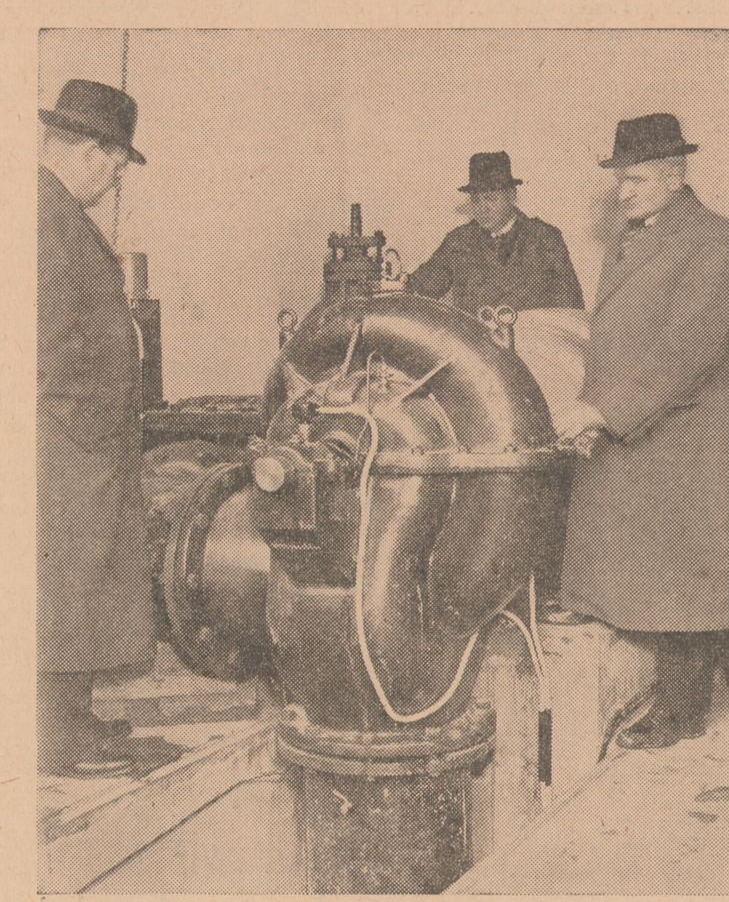 Bilden i sidhuvudet visar det nya pumpverket vid Delsjön. Från vänster syns driftsingenjör Rybeck, tillsyningsman Börjesson och maskinmästare Persson.