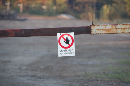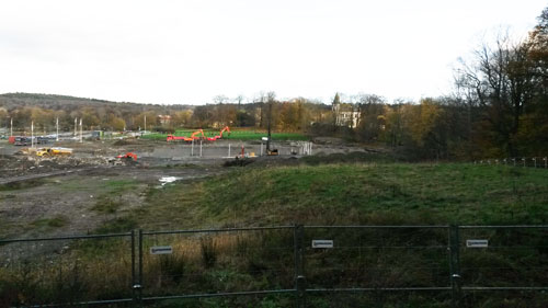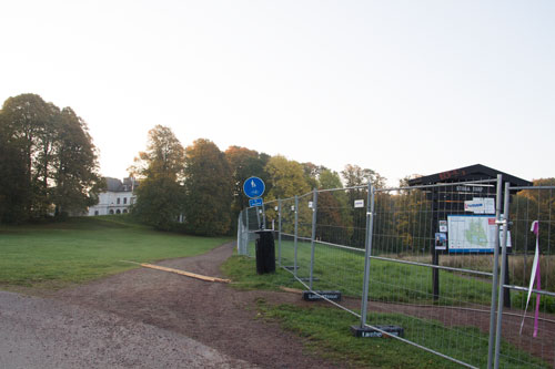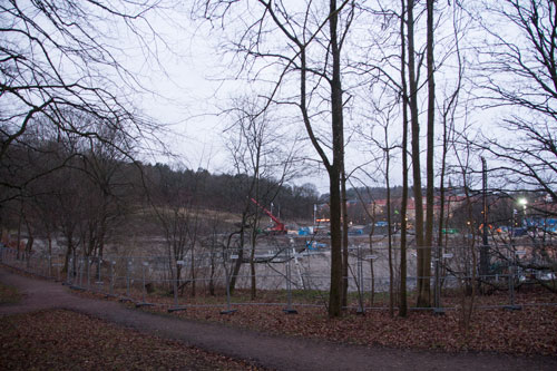 Den 5 oktober, ett stängsel har nu rests kring byggplatsen, men ännu är området mot Delsjövägen öppet. Några mindre bommar har satts upp vid det som kommer att användas som infarter under byggtiden – numera äger ”obehöriga ej tillträde”. Med ett bra objektiv på kameran kan jag ändå fortsätta att presentera närbilder som visar områdets förändring.