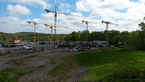 Arbetsplatsen vid Stora Torp är synlig på långt håll. Bilden nedan är från toppen av Överåsen, därifrån har man en storslagen vy över området. Stora Torps huvudbyggnad håller på att skymmas av det ljusgröna lövverket, men också av byggkranar och snart av stora huskroppar.