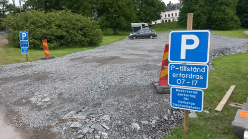 Den 18 juni var dagen före midsommar 2015 och det stod klart vid mitt besök att antagandet om byggbodar omedelbart nedanför Stora Torp var felaktigt. Det var istället en ny tillfällig parkering för hyresgästerna i Stora Torp.