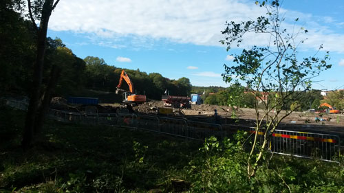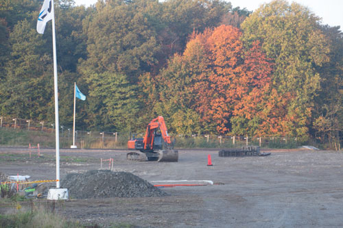 Den 25 september, en barriär av stålbalkar har drivits ned längs med allén invid Stora Torp och schacken blir allt djupare. Några mindre träd i kanten av området har fällts under de senaste dagarna. Tre grävmaskiner var idag i arbete i området. Det tycks vara NCC:s hur som får inleda detta stora byggprojekt.