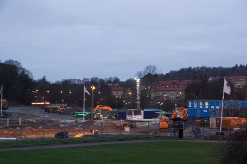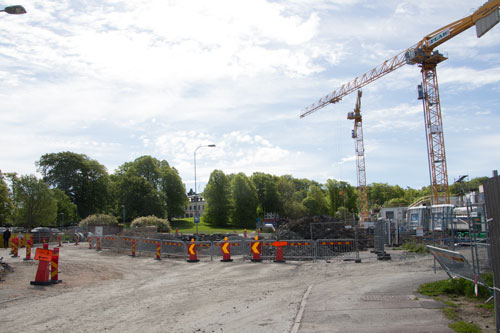 Det stora område som utgjorde parkeringsplatser under Radio- och TV-hustiden har ännu inte hägnats in. Där dröjer det nästan ett år till innan grävskoporna hugger in i området.