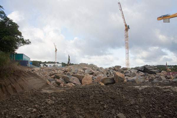 Den 1 juli var det dags för månadens fotorunda kring byggarbetsplatsen, strålande solsken var trevligt men skapade vissa problem för mina vybilder! Poseidon har nu etablerat sig i området och fått upp sina arbetsbodar. Maskinerna var redan i arbete på platsen för det nya hyreshuset.