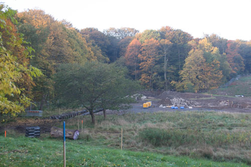 Den 3 september och inledningen på hösten, därmed har också den sista etappen av bygget vid Örgryte Torp inletts. Grundarbetena för Poseidons tre nya hus har pågått några veckor och en bit av skogen har nu försvunnit och man försöker få vattnet från källan och Korpberget att försvinna ned i underjorden. Bilderna nedan jämför samma plats den första maj och tredje september i år.