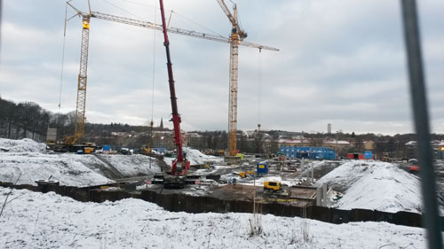 Den 1 mars 2015 blåste det hårda vindar och snöade ihållande, det blev ändå en uppdatering av bilderna både på denna sida och på sidan med vybilder. Ytterligare två stora kranar reser sig nu över området. Två står vid NCC:s hus och en kran uppfördes i fredags (27 februari) vid det som skall bli HSB:s första hus i området.