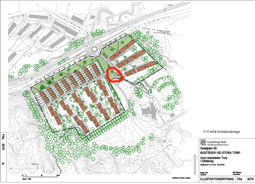 Den 13 juni har arbeten inletts inför byggstarten av Bostads AB Poseidons första hus i området. Det ser ut som om byggbodarna kommer att placeras omedelbart nedanför Stora Torps huvudbyggnad. Ett större område nedanför Stora Torp har nu också fått stängsel, det rödmarkerade området kring den blivande byggnaden på kartan nedan.