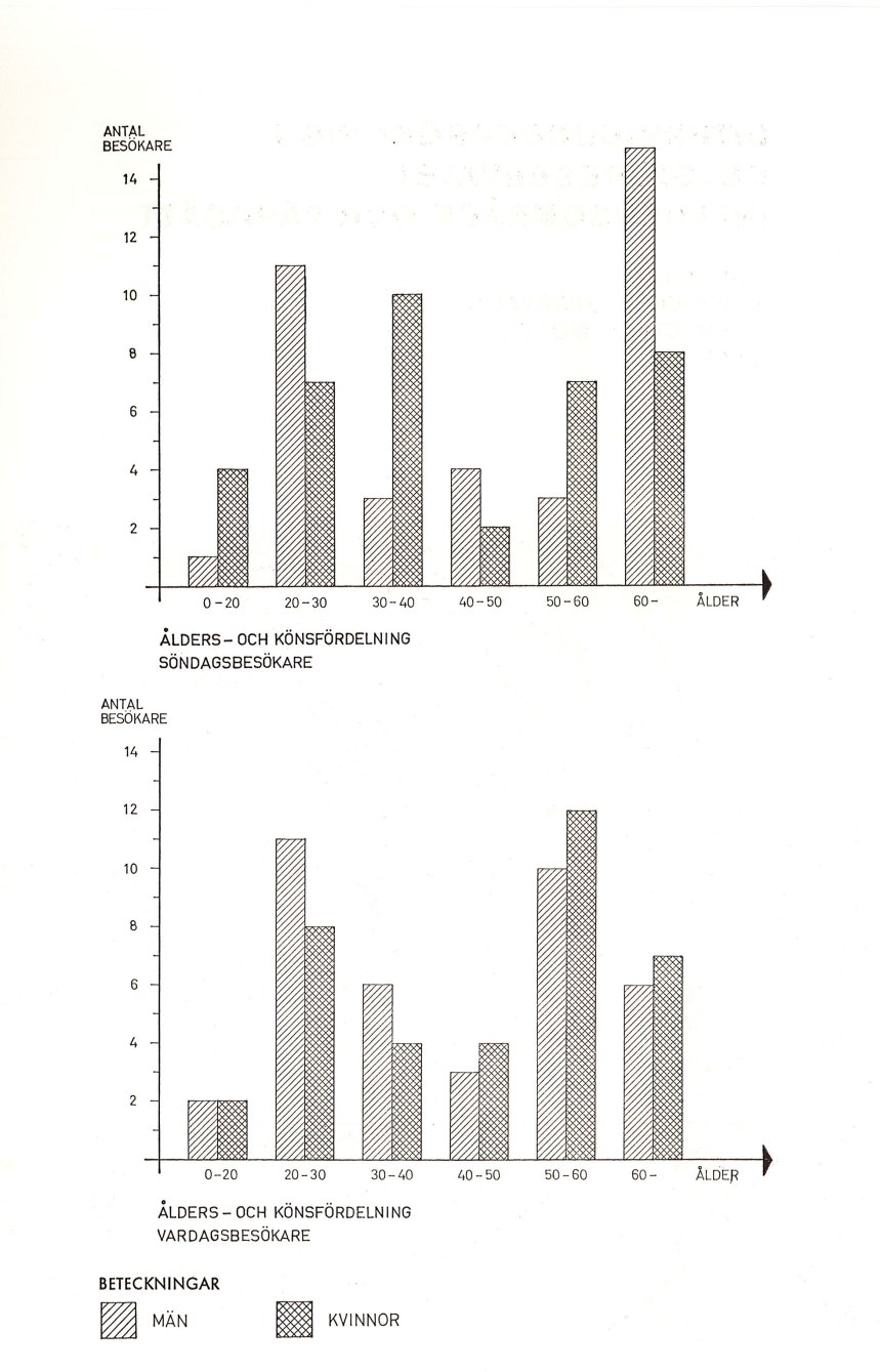 Alla åldersgrupper finns representerade, men med en klar övervikt för personer i 20- 30 år respektive 50 år och äldre. Åldersgruppen 40-50 år är svagt representerad. Barn och ungdom förekommer sparsamt – deras friluftsdagar ligger på förmiddagen och sällan på promenadvägar. Av vardagsbesökarna överväger männen i de lägre och kvinnorna i de högre åldersgrupperna. På söndagarna, då man mest promenerar, är det tvärtom. Könsfördelningen är jämn, lika många män som kvinnor.